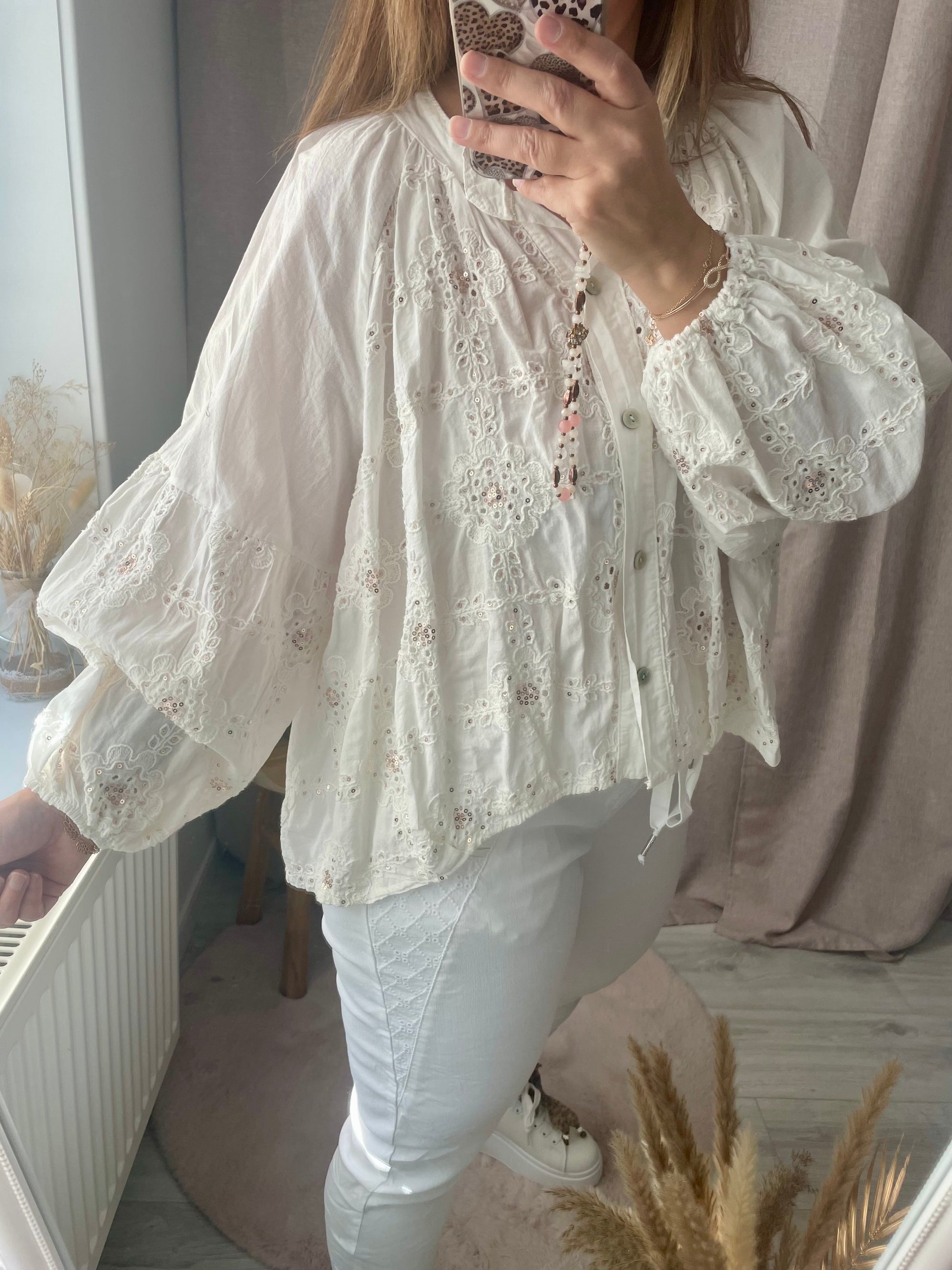 - Magnifique chemise à boutons avec de jolies manches ajourées formant des motifs en crochet avec des petits brillants.
